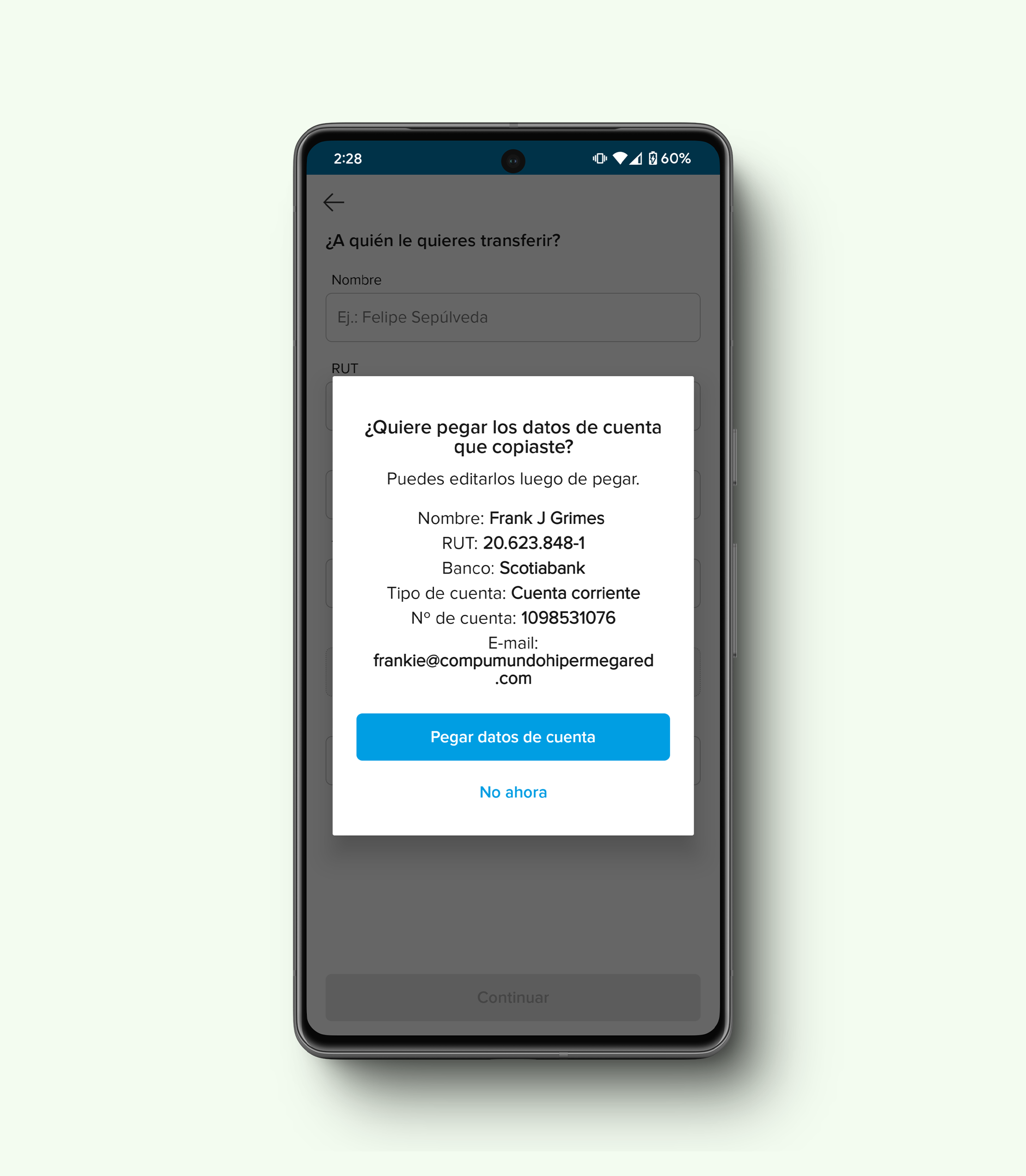 This format has been around for many years, leading to most banking apps in Chile adapting to it. As a result, they usually automatically fill in the data when initiating a transfer to a new recipient.