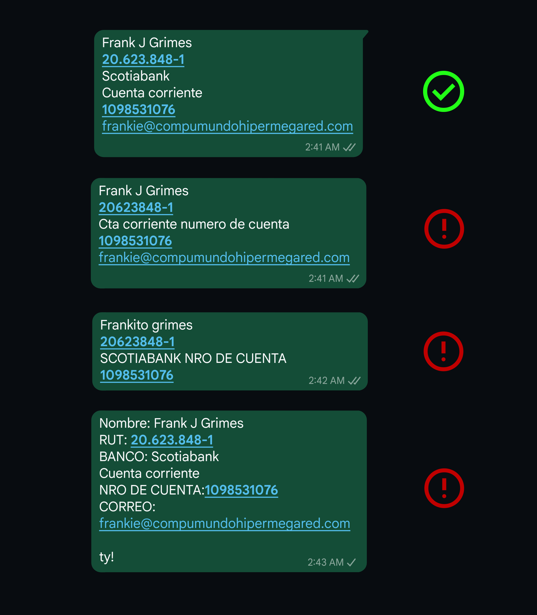 In theory, this system sounds flawless. But in practice, while banks have nailed the art of reading transfer details exactly as they’d write them, they struggle when faced with the creative ways people actually input information. A slight tweak—like rearranging the order, using a non-standard RUT format (12345678-9), or tossing in a casual 'thanks'— often throws the system into chaos, leading to wildly inconsistent results.