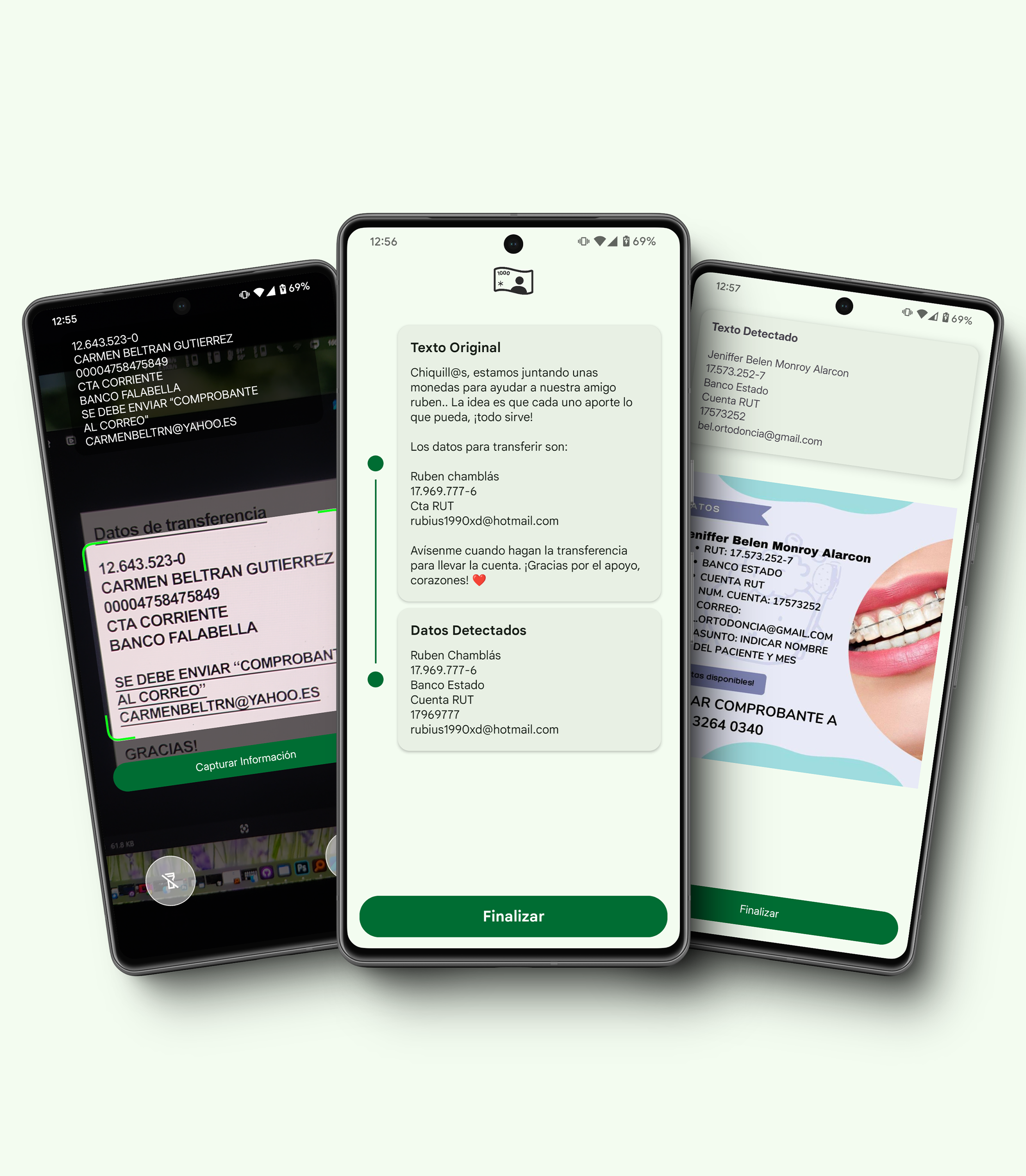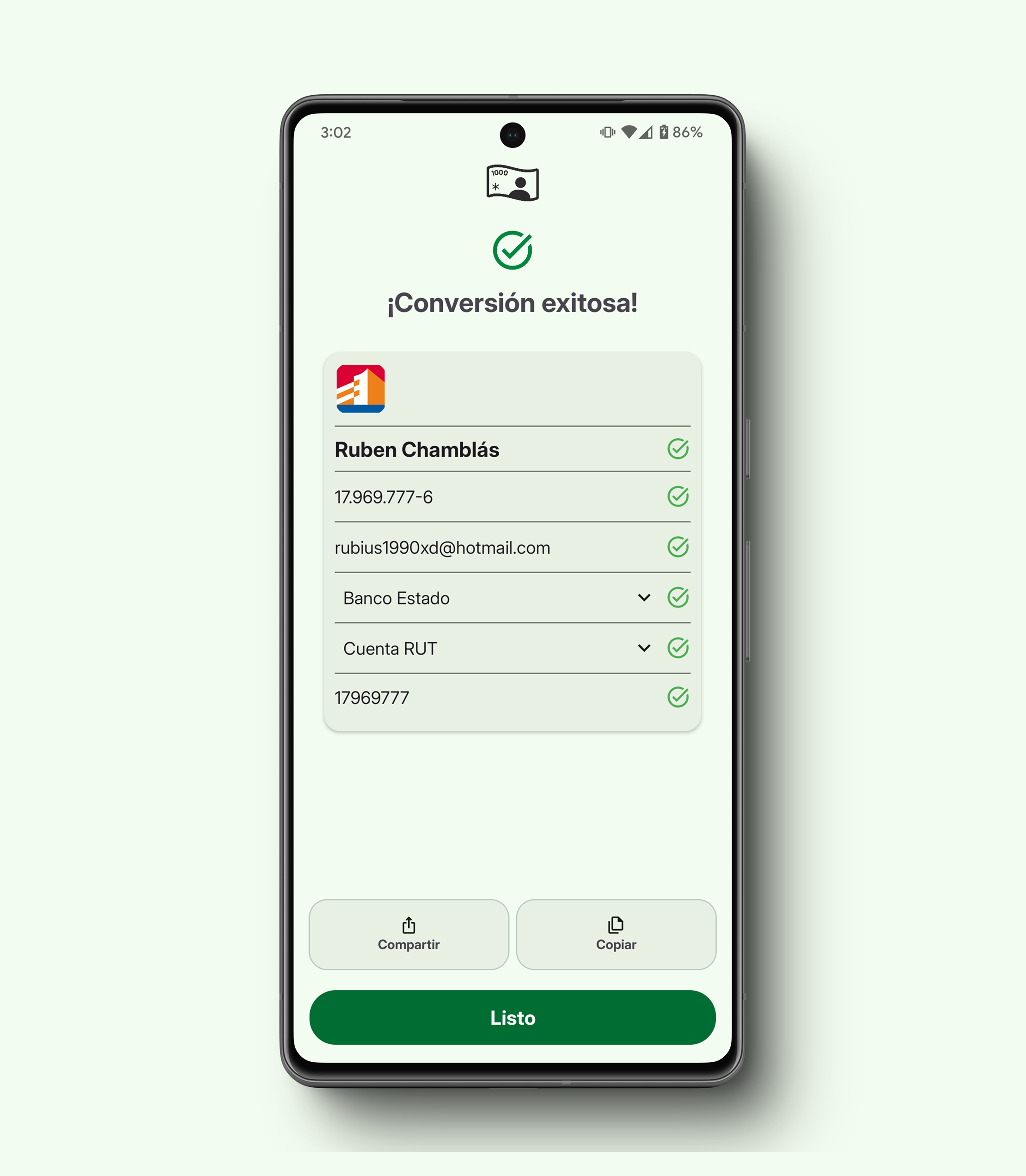 Live Camera: With Luquita, you can use your device’s camera to scan documents, screens, or even handwritten notes. The app instantly detects and extracts crucial details like the recipient’s name, RUT, bank, and account number.